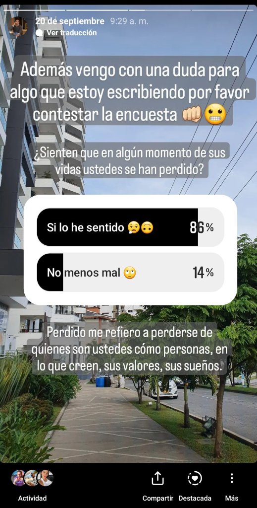 La frase me hizo pensar tanto porque me acordó de alguna época en mi vida en la que me sentí perdido, pero no perdido de para donde ir con mi vida, perdido de quién era yo, lejos de todas aquellas cosas que consideraba parte de mi escencia, de esos principios y valores que en algún momento considere irrenunciables, toda esta reflexión me llevo a otra pregunta la cual era «¿Seré el único que ha sentido esto?» Por lo que procedí a hacer una encuesta en mis redes sociales.